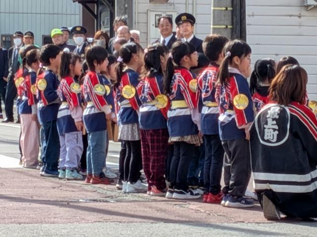 この日のために2施設が合同で「防火のちかい」の言葉を考え、拍子木を打ち鳴らして歩く練習をしながら本番を迎えた28名の年長児。幼年消防団のそろいの法被を身に付けて、大人の消防団に負けない堂々とした行進を披露してくれました。