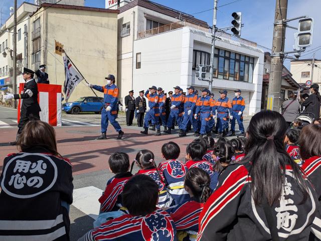 最上中学校の吹奏楽部の演奏が流れる中、子どもたちの元気な「防火のちかい」を受けて、各地区の消防団と消防車・特殊車両が青空をバックに見事な隊列行進を子どもたちに見せてくれました。